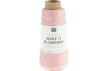 Creative Make It Blümchen is a glittering bobbin thread decorated with delicate sequins in the shape of flowers. The yarn is intended as a carry-along, giving a knitted or crocheted piece an unusual and eye-catching look.